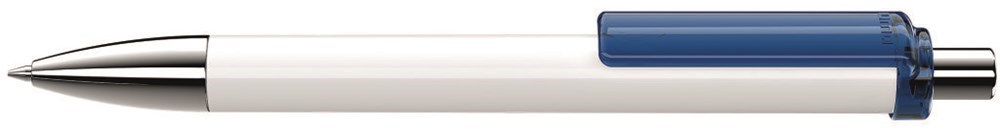 Druckkugelschreiber mit gedeckt glänzendem Schaft, transparent glänzendem Clip, Metallspitze und Metalldrücker glanzverchromt.