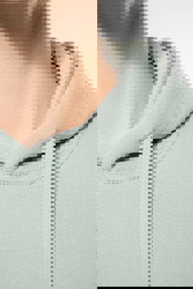 85 % Baumwolle / 15 % Polyester. Aus 85 % biologischer Baumwolle und 15 % recyceltem Polyester post-consumer. Außenseiteaus 100% Baumwolle. Gebürstetes Fleece mit 3 Nähten und LSF-Behandlung (Low Shrinkage Fleece). Gekämmte Baumwolle. Enzymwäsche veredelt. Gerader Schnitt. 1x1 schlauchförmige Strickbündchen für eine optimale Verarbeitung an den Ärmelabschlüssen und am unteren Saum. Kängurutasche. Gefütterte Kapuze aus 100 % Baumwolle, Baumwolljersey 180 g. Ton-auf-Ton Jersey-Nackenband und Halbmond-Finish auf der Krageninnenseite. Doppelnähte an Ärmelbündchen, Saum und Kraten. Kein Markenetikett am Kragen, nur Größenkennzeichnung, für eine leichtere Veredelung.